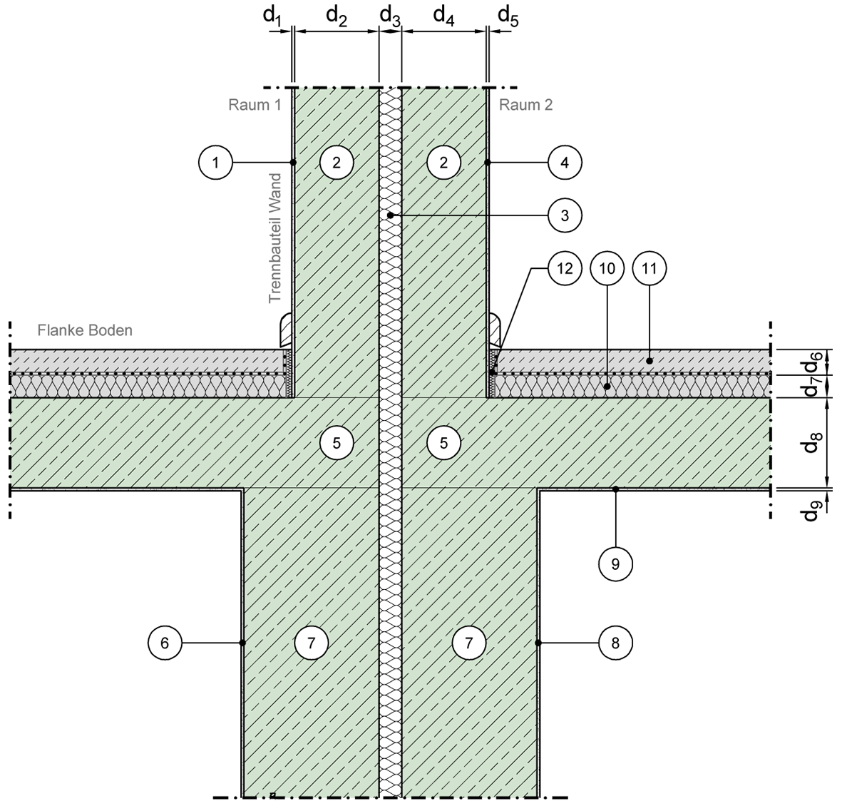 Raum mindestens ein Geschoß über Bodenplatte, vollständige Trennung der Schalen und der flankierenden Bauteile ab Oberkante Bodenplatte
