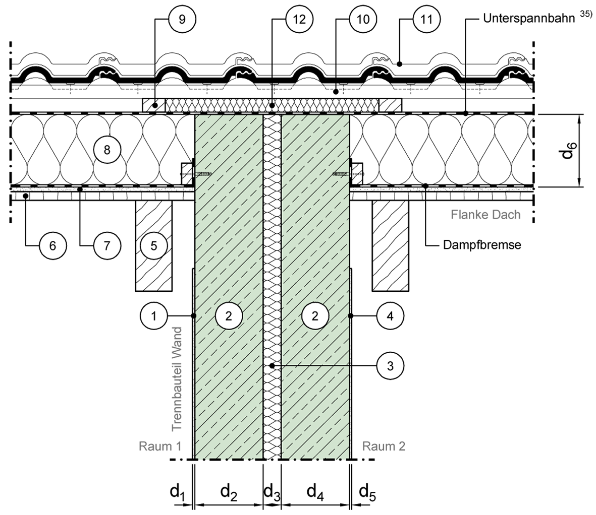 Dachkonstruktion durch Trennwand unterbrochen, Lattung und Wärmedämmung getrennt, ohne zusätzliche Bedämpfungsmaßnahme, zusätzliche Beschwerungslage (einlagig), Sparren offen
