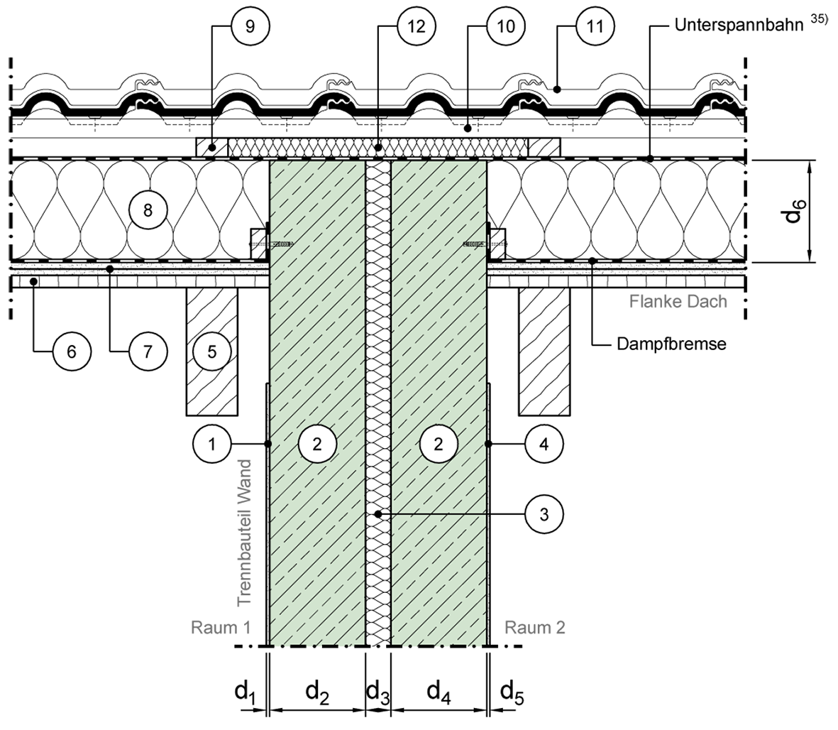 Dachkonstruktion durch Trennwand unterbrochen, Lattung und Wärmedämmung getrennt, ohne zusätzliche Bedämpfungsmaßnahme, zusätzliche Beschwerungslage (mehrlagig), Sparren offen