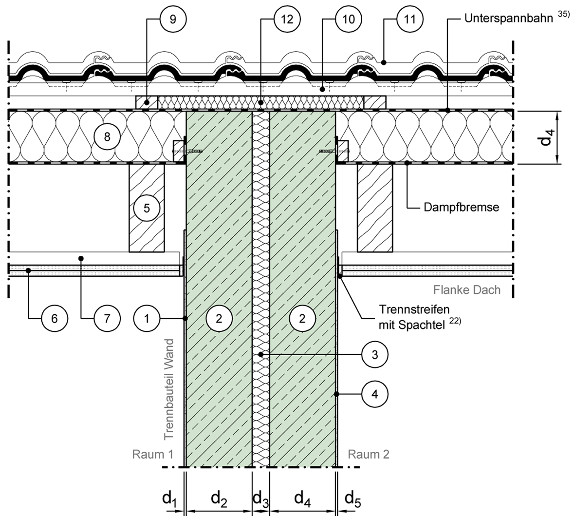 Dachkonstruktion durch Trennwand unterbrochen, Lattung und Wärmedämmung getrennt, ohne zusätzlicheBedämpfungsmaßnahme, Sparren verkleidet