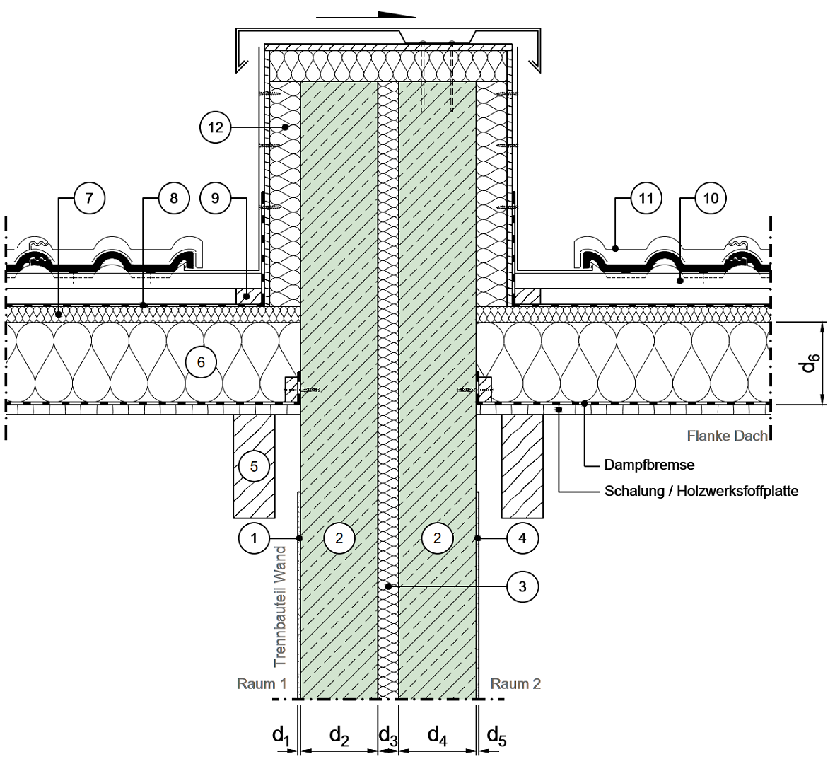 Dachkonstruktion durch Trennwand unterbrochen, Lattung und Wärmedämmung getrennt, Dachkonstruktion vollständig unterbrochen, zusätzliche Dämmung oben, Sparren offen