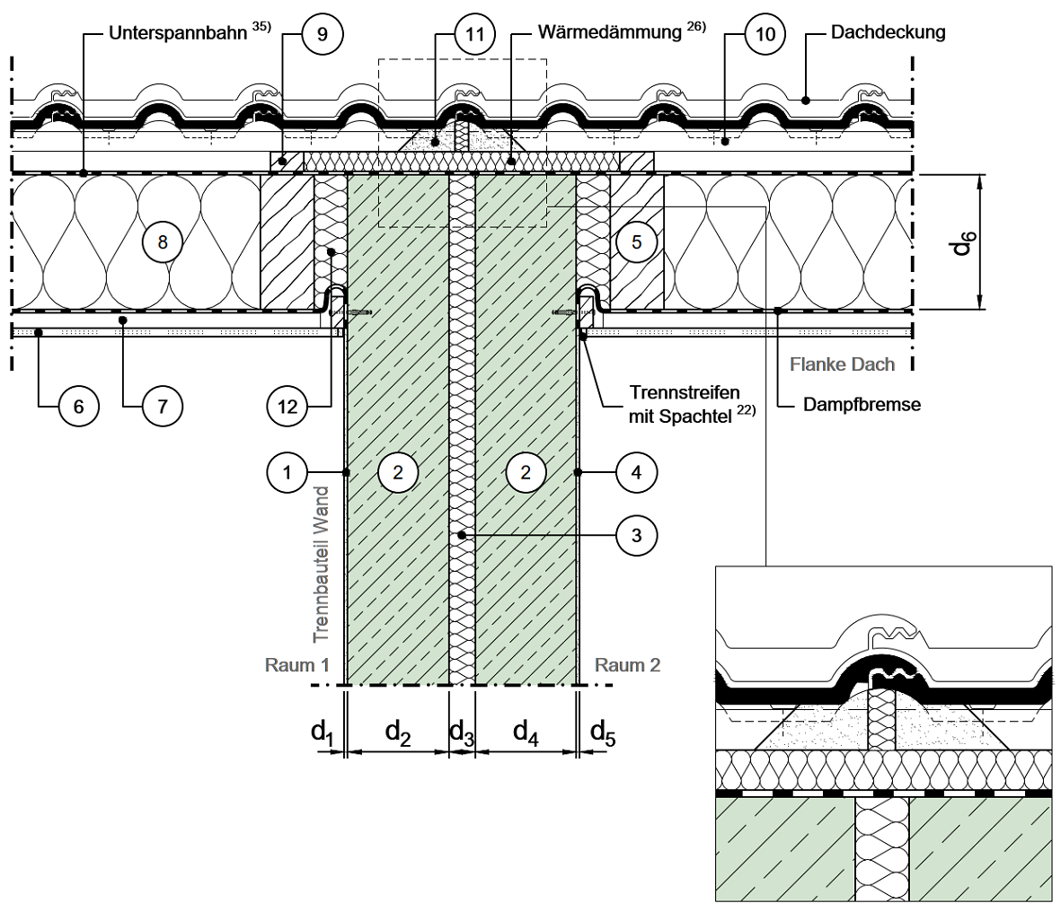 Dachkonstruktion durch Trennwand unterbrochen, Lattung und Wärmedämmung getrennt, mit zusätzlicher Bedämpfungsmaßnahme, mit Vollsparrendämmung