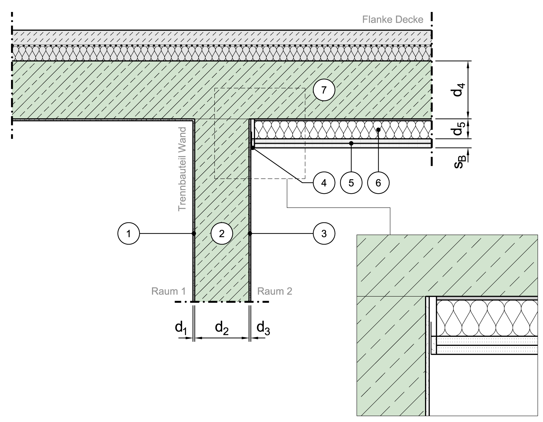 Massivdecke mit Vorsatzschale, flächig befestigt 2), Aufbau nur in einem Raum,
