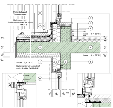 Balkonplatte, Fenster/Tür in beiden Geschossen, Fensterlage in Dämmebene