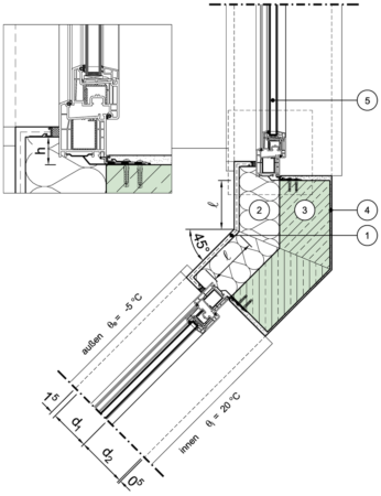 Innenecke 45°, mit zwei symmetrischen Fenstern, Fensterlage in Dämmebene