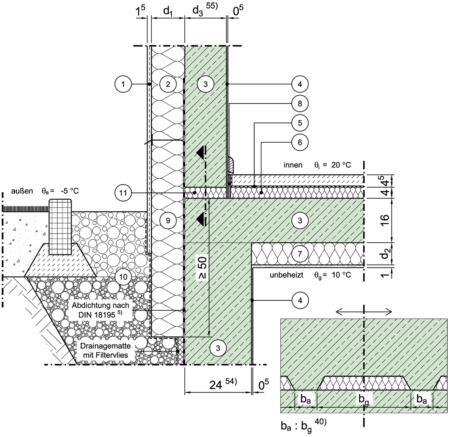 im Sockelbereich, Decke zu unbeheiztem Keller, außenseitig gedämmt, thermisch optimiert