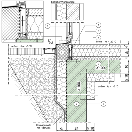 im Sockelbereich, Decke zu Außenluft von unten (z.B. Tiefgarage), innenseitig gedämmt, mit Fenster/Tür