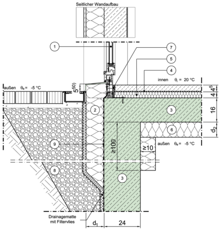 im Sockelbereich, Decke zu Außenluft von unten (z.B. Tiefgarage), außenseitig gedämmt, mit Fenster/Tür