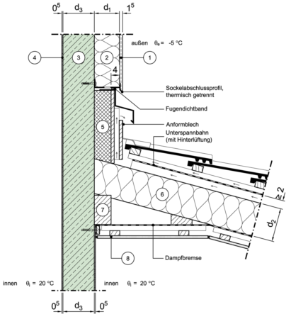 Anschluss an aufgehende Wand, zu beheiztem Dachraum, Pfettendach (15°), mit Zwischensparrendämmung, Wandebene
