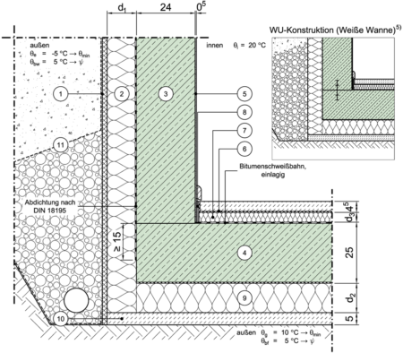 perimetergedämmt, Abdichtung nach DIN 18195 (schwarze Wanne)/WU-Konstruktion (weiße Wanne)