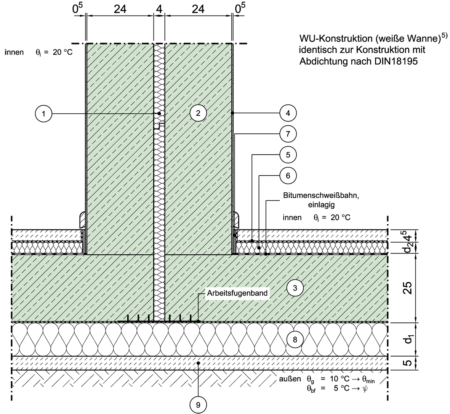 Gebäudetrennwand, perimetergedämmt, Abdichtung nach DIN 18195 (schwarze Wanne)/WU-Konstruktion (weiße Wanne)