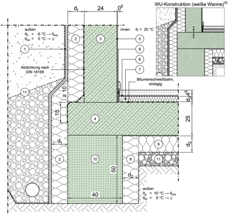 perimetergedämmt, Abdichtung nach DIN 18195 (schwarze Wanne)/WU-Konstruktion (weiße Wanne), Streifengründung innenseitig gedämmt