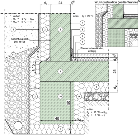 perimetergedämmt, Abdichtung nach DIN 18195 (schwarze Wanne)/WU-Konstruktion (weiße Wanne), Streifengründung komplett gedämmt