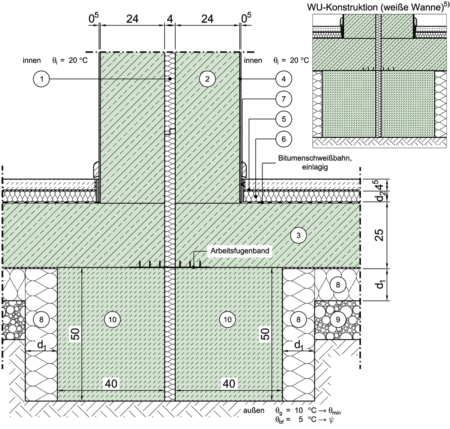 Gebäudetrennwand, perimetergedämmt, Abdichtung nach DIN 18195 (schwarze Wanne)/WU-Konstruktion (weiße Wanne), Streifengründung innenseitig gedämmt