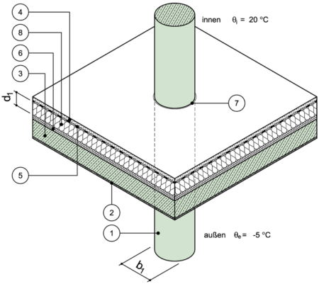 Lokale Durchdringung einer Stahlbetonstütze durch Decke zu Außenluft nach unten (z.B. Tiefgarage)