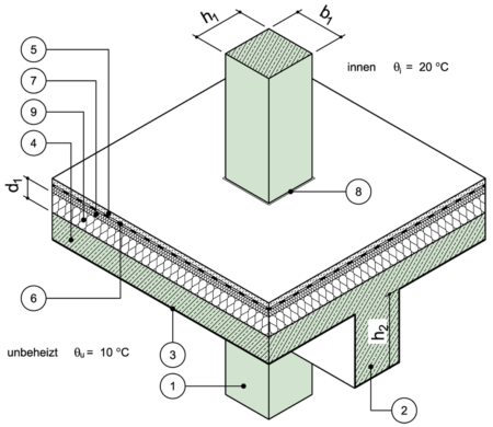 Lokale Durchdringung einer Stahlbetonstütze durch Decke zu unbeheiztem Raum nach unten