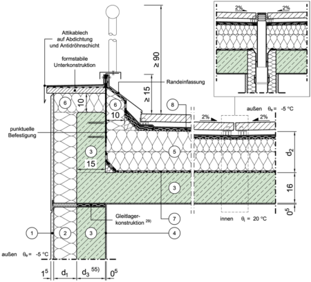 Massivdach, nicht belüftet, Attika umlaufend gedämmt, mit aufstehendem Geländer (begehbar), Wandebene