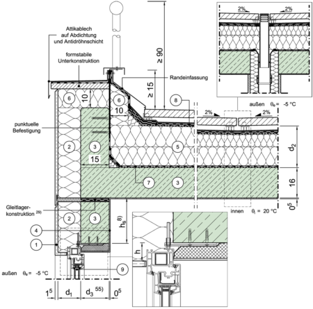 Massivdach, nicht belüftet, Attika umlaufend gedämmt, mit aufstehendem Geländer (begehbar), Fenster/Tür im unteren Geschoss, Fensterlage in Dämmebene