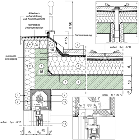 Massivdach, nicht belüftet, Attika umlaufend gedämmt, mit aufstehendem Geländer (begehbar), Fenster/Tür im unteren Geschoss mit Rollladenkasten, Fensterlage in Wand- und Dämmebene
