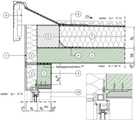 Massivdach, nicht belüftet, mit Abschlußprofil (nicht begehbar), Fenster/Tür im unteren Geschoss, Fensterlage in Dämmebene