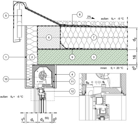 Massivdach, nicht belüftet, mit Abschlußprofil (nicht begehbar), Fenster/Tür im unteren Geschoss mit Rollladenkasten, Fensterlage in Wand- und Dämmebene