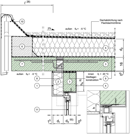 Massivdach, nicht belüftet, thermisch getrenntes auskragendes Betonelement als überstehendes Dach (nicht begehbar), Fenster/Tür im unteren Geschoss, Fensterlage in Wandebene