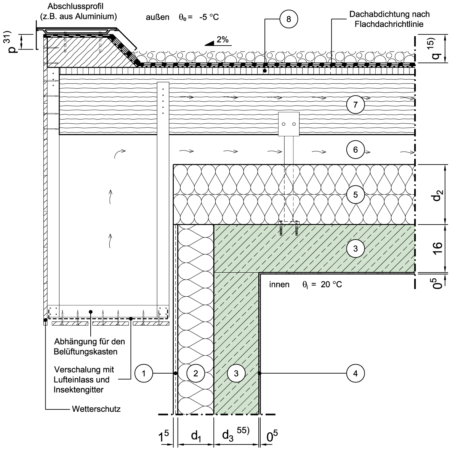 Massivdach, belüftet, mit Belüftungskasten (nicht begehbar), Wandebene