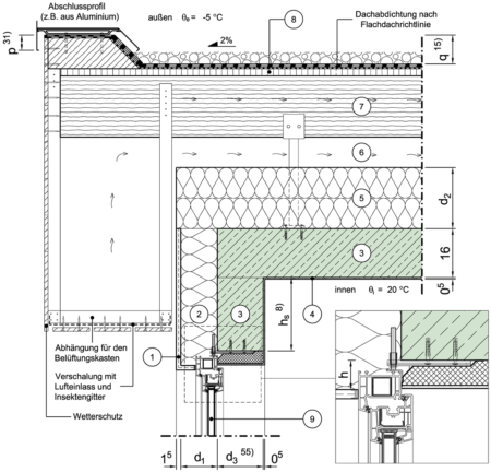 Massivdach, belüftet, mit Belüftungskasten (nicht begehbar), Fenster/Tür im unteren Geschoss, Fensterlage in Dämmebene