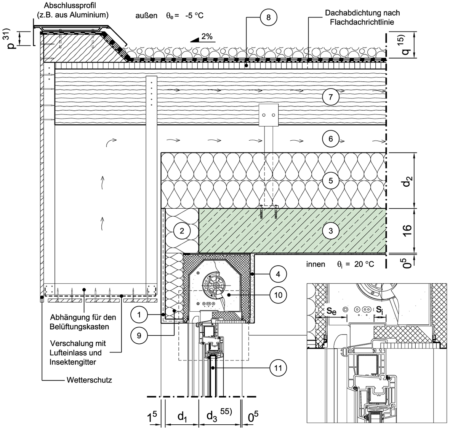 Massivdach, belüftet, mit Belüftungskasten (nicht begehbar), Fenster/Tür im unteren Geschoss mit Rollladenkasten, Fensterlage in Wand- und Dämmebene