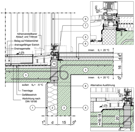 barrierefreier Balkonanschluss, Variante 1, Fenster/Tür im oberen Geschoss, Fensterlage in Dämmebene