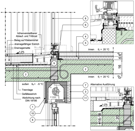 barrierefreier Balkonanschluss, Variante 1, Fenster/Tür in beiden Geschossen, mit Rollladenkasten, Fensterlage in Dämmebene