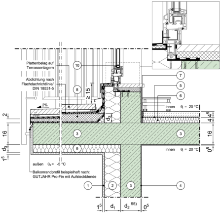 Balkonplatte, Fenster/Tür im oberen Geschoss, Fensterlage in Dämmebene