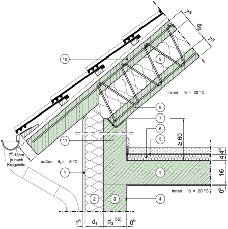 zu beheiztem Dachraum, Massivdach, Zweischaliges Normalbetonfertigteil (Syspro), mit Kniestock, Wandebene