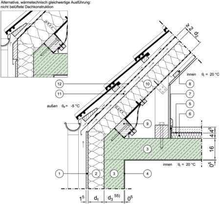 zu beheiztem Dachraum, Sparrendach 45°, mit Zwischensparrendämmung, Variante 2, Wandebene
