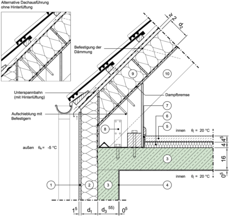 zu beheiztem Dachraum, Sparrendach 45°, mit Aufsparrendämmung, Variante 2, Wandebene
