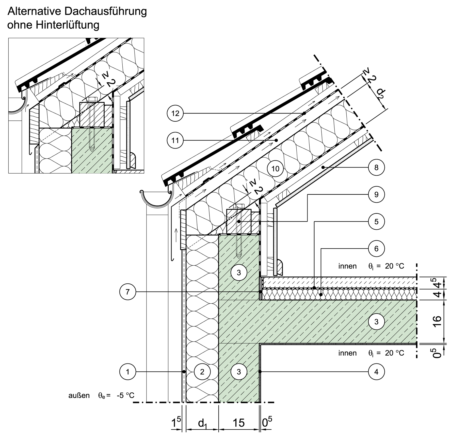 zu beheiztem Dachraum, Pfettendach 35°, mit Zwischensparrendämmung, Variante 2, Wandebene