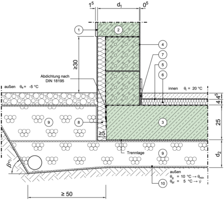 | 9 | Dicke der Dämmung von Decken gegen Erdreich (Bodenplatten) | d | m |