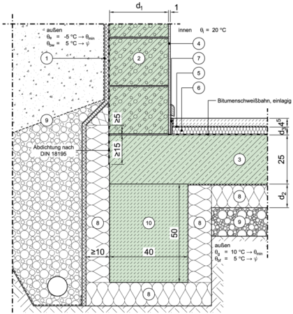 perimetergedämmt, Abdichtung nach DIN 18195, Streifengründung komplett gedämmt