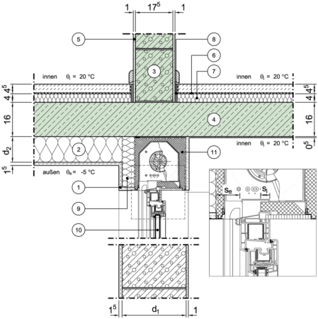 Fenster/Tür mit Rollladenkasten, Fensterlage jew. in Wand- und Dämmebene