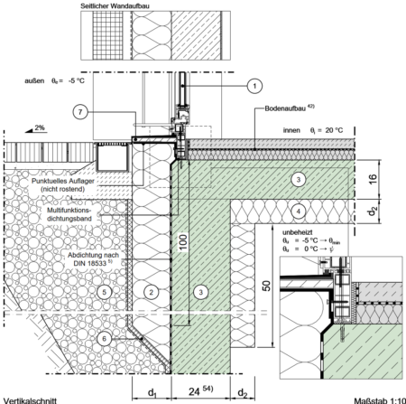 Im Sockelbereich Decke zu Außenluft von unten (z.B. Tiefgarage), außenseitig gedämmt, Fenster/Tür in der Wandebene