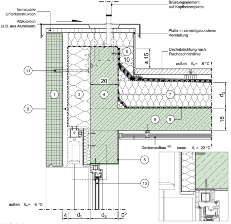 Massivdach, nicht belüftet, Attika umlaufend gedämmt, mit aufstehendem Geländer (begehbar), Fenster mit Verschattungseinrichtung, Fensterlage in Wandebene