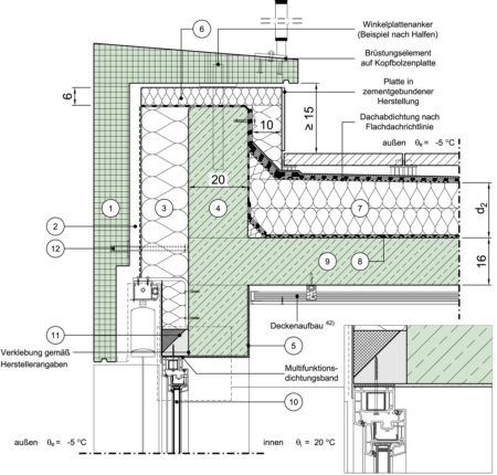 Massivdach, nicht belüftet, Attika umlaufend gedämmt, mit Betonabdeckung, begehbares Dach, Fenster mit Verschattungseinrichtung, Fensterlage in Dämmebene
