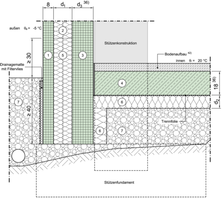 Bodenplatte perimetergedämmt, Sockel zusätzlich innen gedämmt