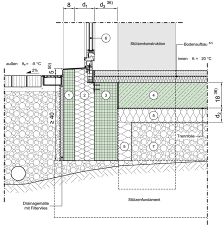 Bodenplatte perimetergedämmt, Sockel zusätzlich innen gedämmt, Fenster/Tür in Dämmebene