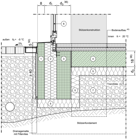 Bodenplattengründungspolster aus Glasschaumschotter/Glasschaumgranulat, Variante 1, komplett gedämmte Bodenplatte, Fenster/Tür in Dämmebene
