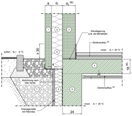 Im Sockelbereich an beheizten Keller, Tragschicht durchlaufend, Erdreich auf Deckenniveau