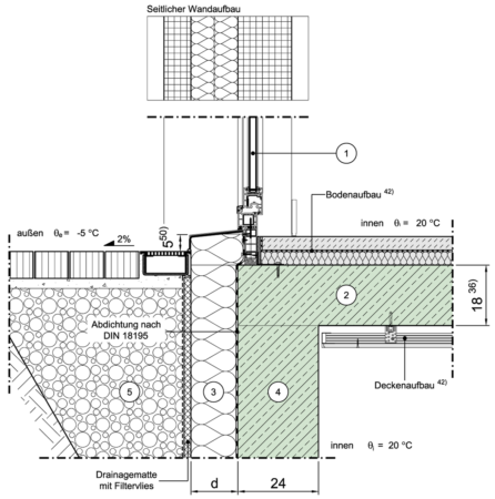 Im Sockelbereich an beheizten Keller, Tragschicht durchlaufend, Erdreich auf Deckenniveau, Fenster/Tür in der Wandebene, Var. 1