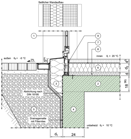 Im Sockelbereich an unbeheizten Keller, innenseitig gedämmt, Tragschicht punktuell gelagert (thermisch getrennt), Erdreich auf Deckenniveau, Fenster/Tür in der Wandebene, Var. 1