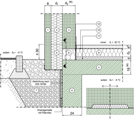Im Sockelbereich an Außenluft (z.B. Tiefgarage), innenseitig gedämmt, Tragschicht punktuell gelagert (thermisch getrennt), Erdreich auf Deckenniveau
