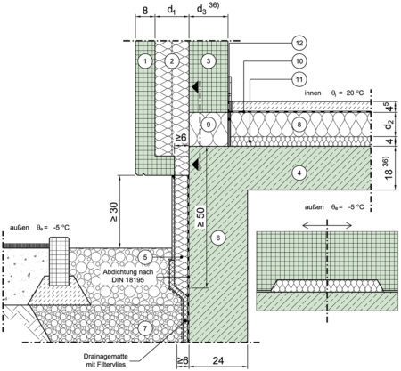Im Sockelbereich an Außenluft (z.B. Tiefgarage), innenseitig gedämmt, Tragschicht punktuell gelagert (thermisch getrennt), Erdreich unter Deckenniveau